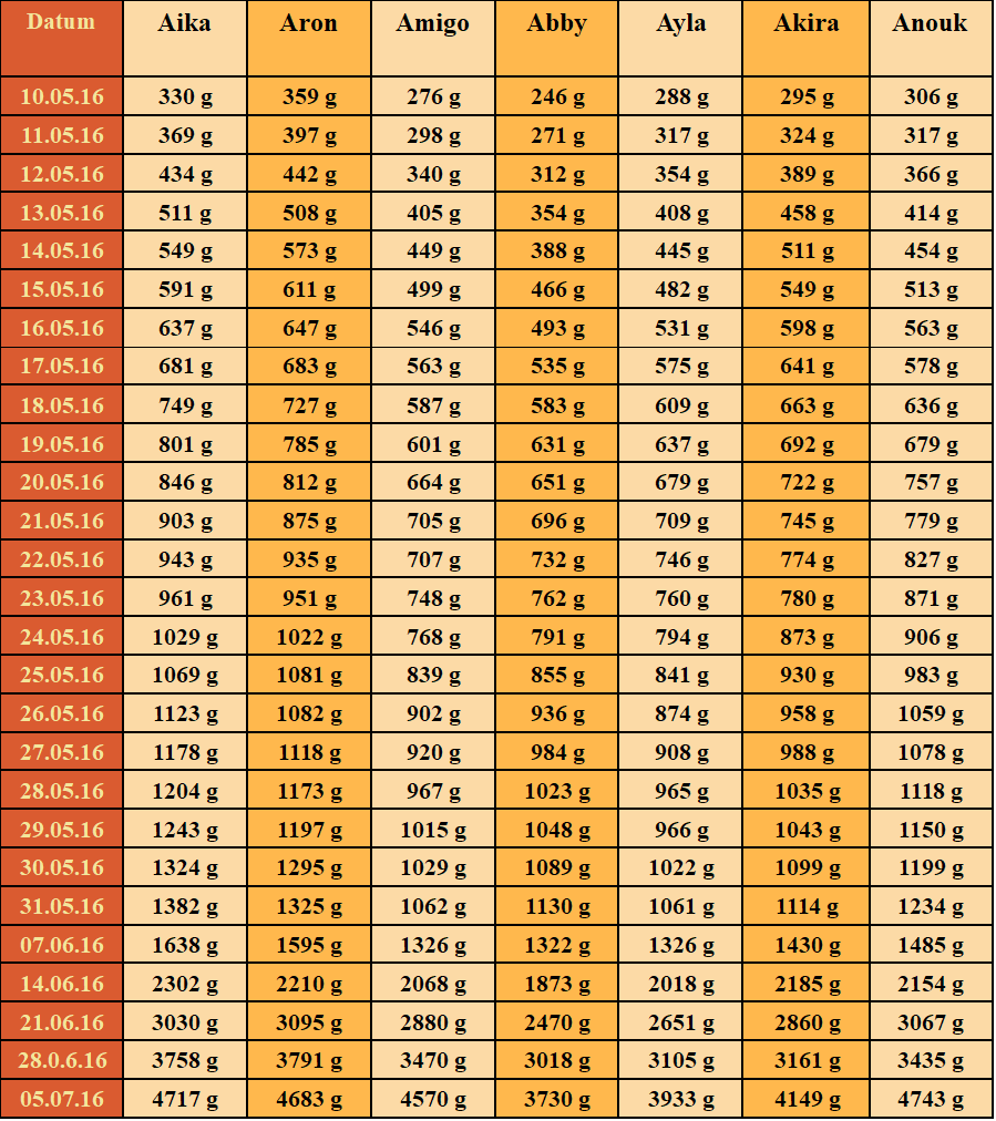 Gewichtstabelle A2-Wurf von den Buschchaoten